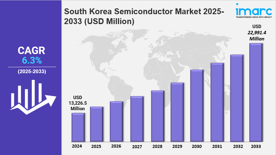 The South Korea semiconductor market size reached USD 13,226.5 Million in 2024 and is projected to grow to USD 22,991.4 Million by 2033. The market is expected to expand at a CAGR of 6.3% during the forecast period of 2025-2033. Growth is driven by increasing demand for electronics and connectivity in consumer and industrial sectors, alongside rising usage of wearable devices across the country.