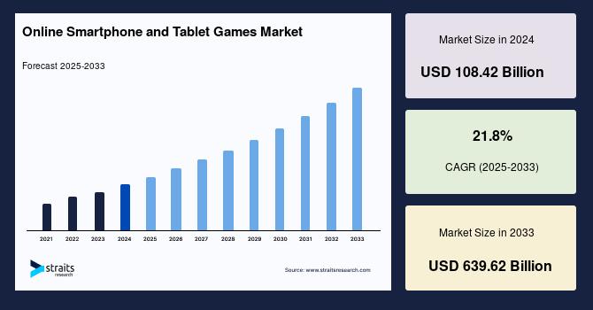 According to StraitsResearch, the global online smartphone and tablet games market size is valued at USD 108.42 billion  in 2024 and is estimated to reach USD 639.62 billion by 2033, growing at a CAGR of 21.8% during 2025-2033.