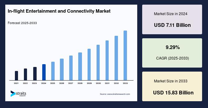 According to StraitsResearch, the global in flight entertainment and connectivity market size is valued at USD 7.11 billion in 2024 and is estimated to reach USD 15.83 billion by 2033, growing at a CAGR of 9.29% during 2025-2033.