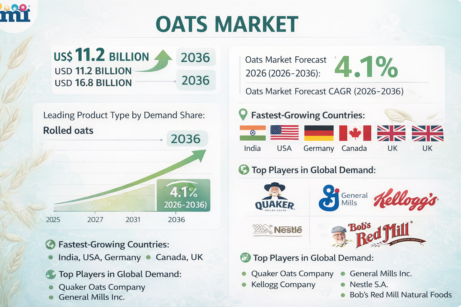 As oats evolve from a commodity breakfast grain to a multifunctional ingredient, they are securing a more resilient demand base. The projected increase from USD 11.2 billion in 2026 to USD 16.8 billion in 2036 underscores the category’s adaptability and long-term relevance.