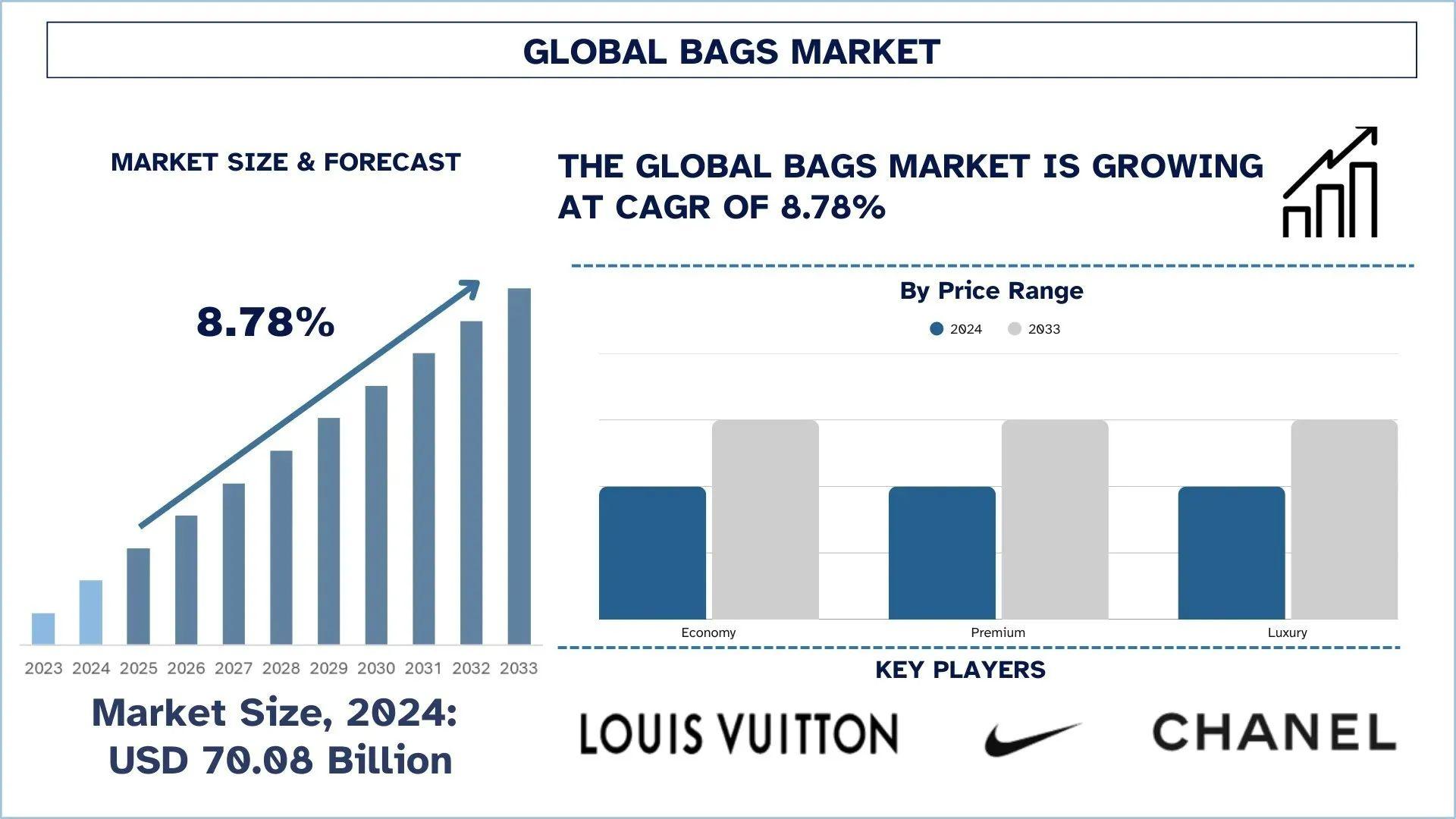 According to UnivDatos analysis, rising fashion consciousness, increasing travel and tourism activities, growing demand for functional and lifestyle accessories, expanding e-commerce penetration, rising disposable income, and increasing preference for sustainable and customized products are the major factors driving the growth of the global bags market. As per their “Bags Market” report, the global market was valued at USD 70.08 billion in 2024, growing at a CAGR of about 8.78% during the forecast period from 2025 - 2033 to reach USD billion by 2033.