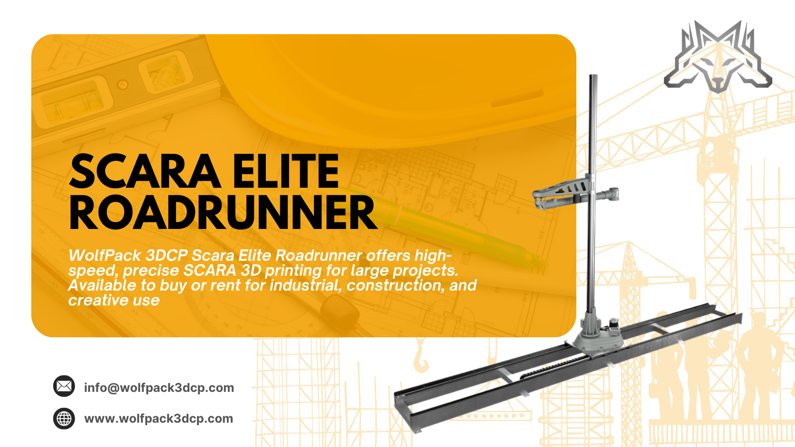 The Scara Elite Roadrunner from WolfPack 3DCP is a high-speed, precise, and versatile SCARA 3D printer suitable for construction, industrial prototyping, education, and creative applications. Its ability to handle large-scale prints and diverse materials ensures efficiency, reliability, and precision across industries.