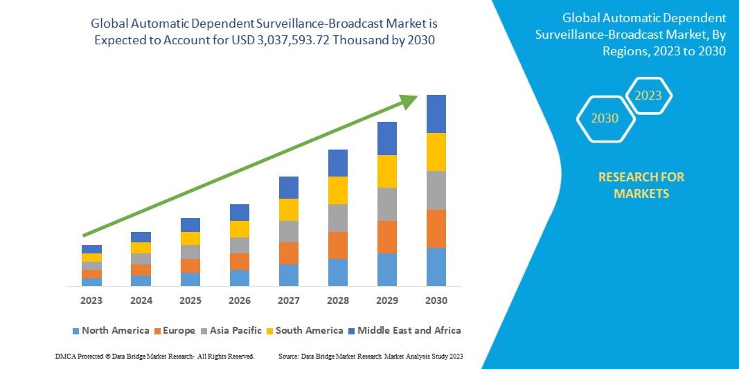 Data Bridge Market Research analyses that the global automatic dependent surveillance-broadcast market is expected to reach a value of USD 3,037,593.72 thousand by 2030, at a CAGR of 18.7% during the forecast period.Trustworthy sources such as websites, journals, mergers, newspapers and other authentic sources have been referred to collect all the stats, data, facts and figures required to structure this Automatic Dependent Surveillance-Broadcast Market It is a comprehensive and proficient report that focuses on primary and secondary market drivers, market share, leading segments, and geographical analysis. The market share of major competitors on a global level is studied, where key areas such as Europe, North America, Asia Pacific, and South America are taken into account in this market research report. The keyword business document also provides better market insights with which businesses can be driven in the right direction.
