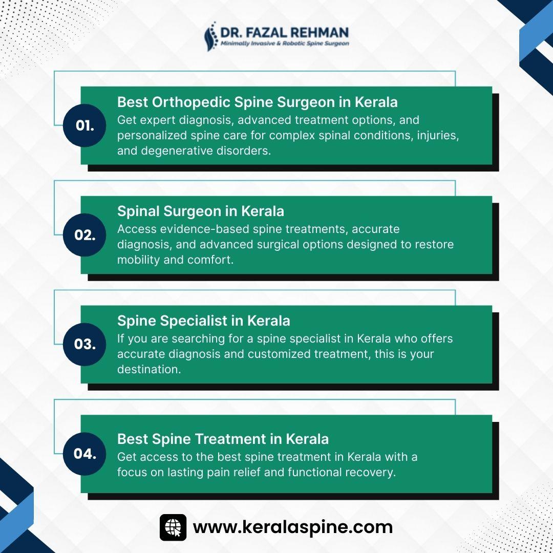 • Get access to the best spine treatment in Kerala with a focus on lasting pain relief and functional recovery. Whether you need non-surgical management or advanced spine surgery, treatments are tailored to your condition and lifestyle. Patients benefit from modern techniques, accurate evaluation, and holistic care. Under the expertise of Dr Fazal Rehman, spine patients in Kerala receive trusted, result-oriented treatment with high standards of safety and precision.